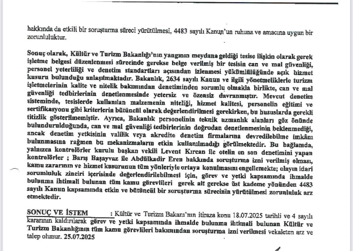 Danıştay, Kontrolörler Kurulu Başkanvekili Levent Kırcan ile otelin son denetimini yapan kontrolörler Barış Başayvaz ile Abdülkadir Eren hakkında soruşturma izni verdi.