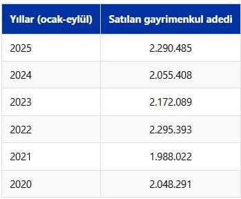 Ülke genelinde 2020-2025 yılları ocak-eylül dönemleri dikkate alındığında satılan gayrimenkul adetleri şöyle: