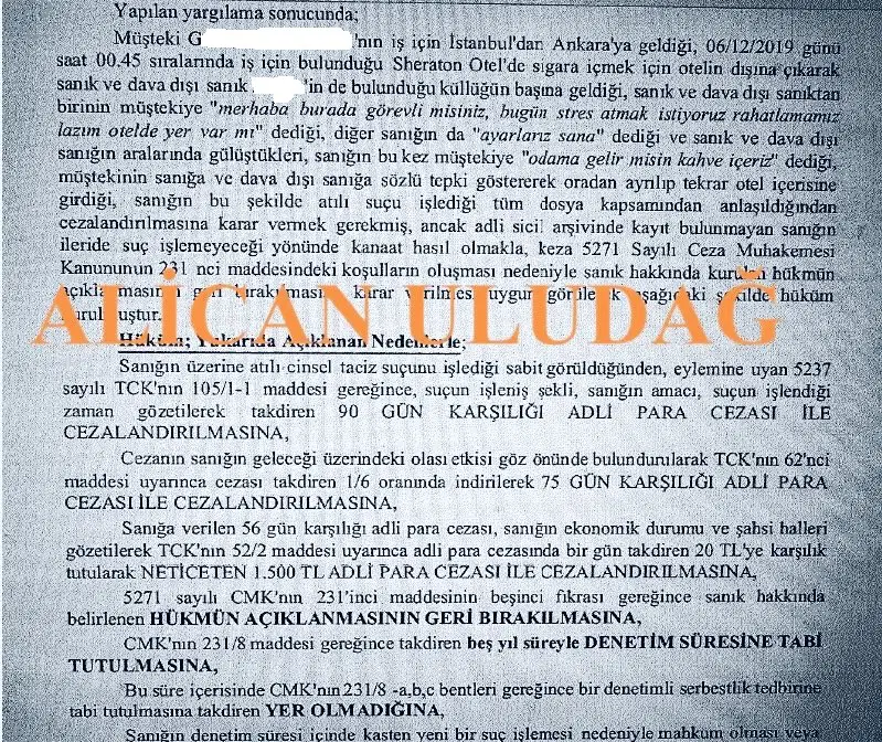 Aktaş’ın savunmasına rağmen mahkeme, sanığı “cinsel taciz” suçundan suçlu bularak 1500 TL adli para cezasına hükmetti. Verilen cezanın kesinleştiği ve Aziz İhsan Aktaş’ın adli sicil kaydına işlendiği belirtildi.