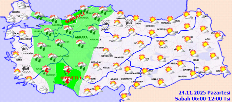Yağışların özellikle Muğla’nın doğusu ile Antalya, Isparta, Düzce, Zonguldak ve Bartın çevrelerinde kuvvetli olacağı öngörülüyor.